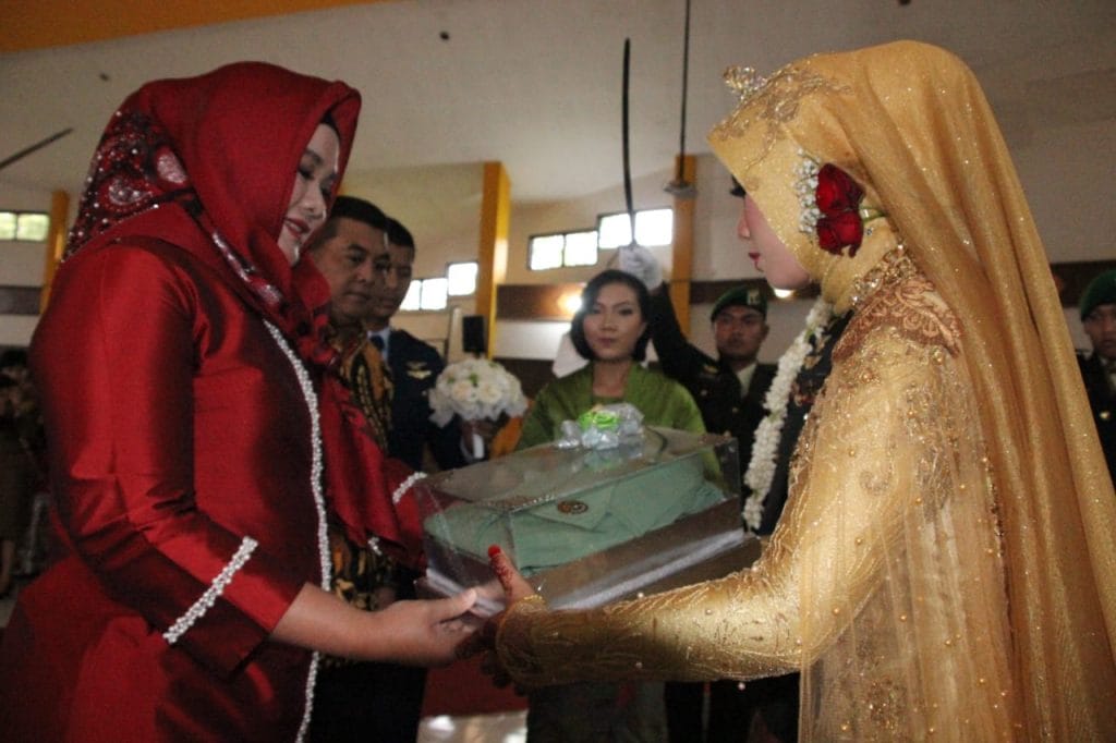 Serta penyerahaan pakaian Persit kepada mempelai putri diberikan oleh Ketua Persit KCK Cabang XXXII Kodim 0818 Ny Dewi Ferry Muzawwad.