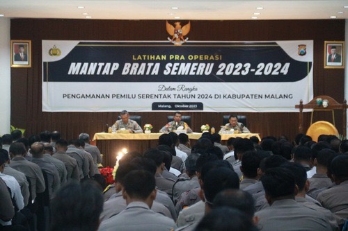 MEMOX.CO.ID – Dalam persiapan menyongsong Pemilihan Umum (Pemilu) dan Pemilihan Kepala Daerah (Pilkada) serentak yang akan diselenggarakan tahun 2024 mendatang, Polres Malang menggelar Latihan Pra Operasi (Latpraops) Kepolisian Terpusat Mantap Brata Semeru di Ballroom Hotel Grand Kanjuruhan, Kepanjen Kabupaten Malang, Jumat (13/10/2023).