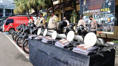Selain memberikan piagam penghargaan, Kapolresta Malang Kota AKBP Buher juga menyerahkan secara simbolis 10 kendaraan dinas roda dua (R2) dan helm erta kelengkapan lainnya seperti megaphone, tongkat T, borgol, jas hujan serta tas punggung, kepada Polsek jajaran, untuk menunjang tugas-tugas sehari-hari seperti patroli dan pelayanan kepada masyarakat lainnya. (fik)