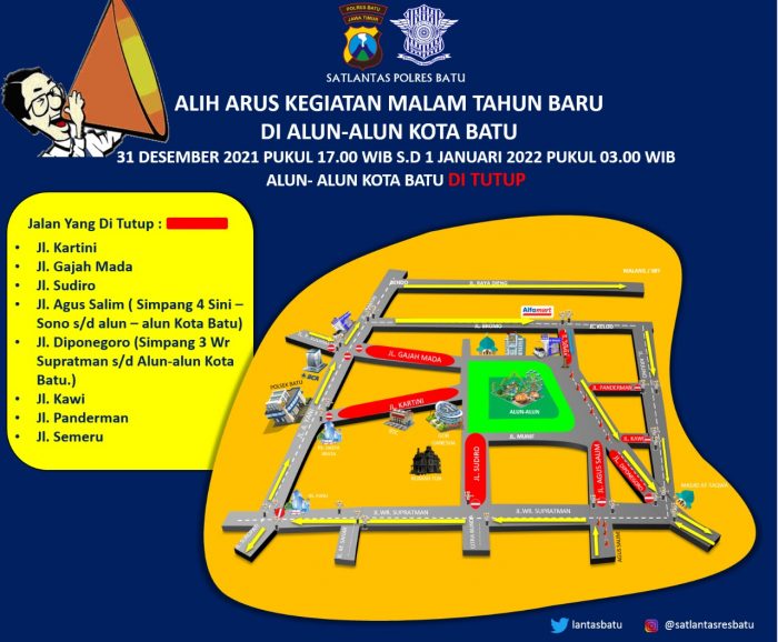 “Pelaksanaannya hari ini tanggal 31 Desember 2021 Pukul 17.00 WIB sampai dengan tanggal 01 Januari 2022 Pukul 03.00 WIB. Penutupan ruas jalan menuju Alun-alun Kota Wisata Batu dilakukan untuk membatasi masyarakat yang ingin beraktivitas merayakan malam tahun baru di Alun-alun,” ujar AKP Indah.