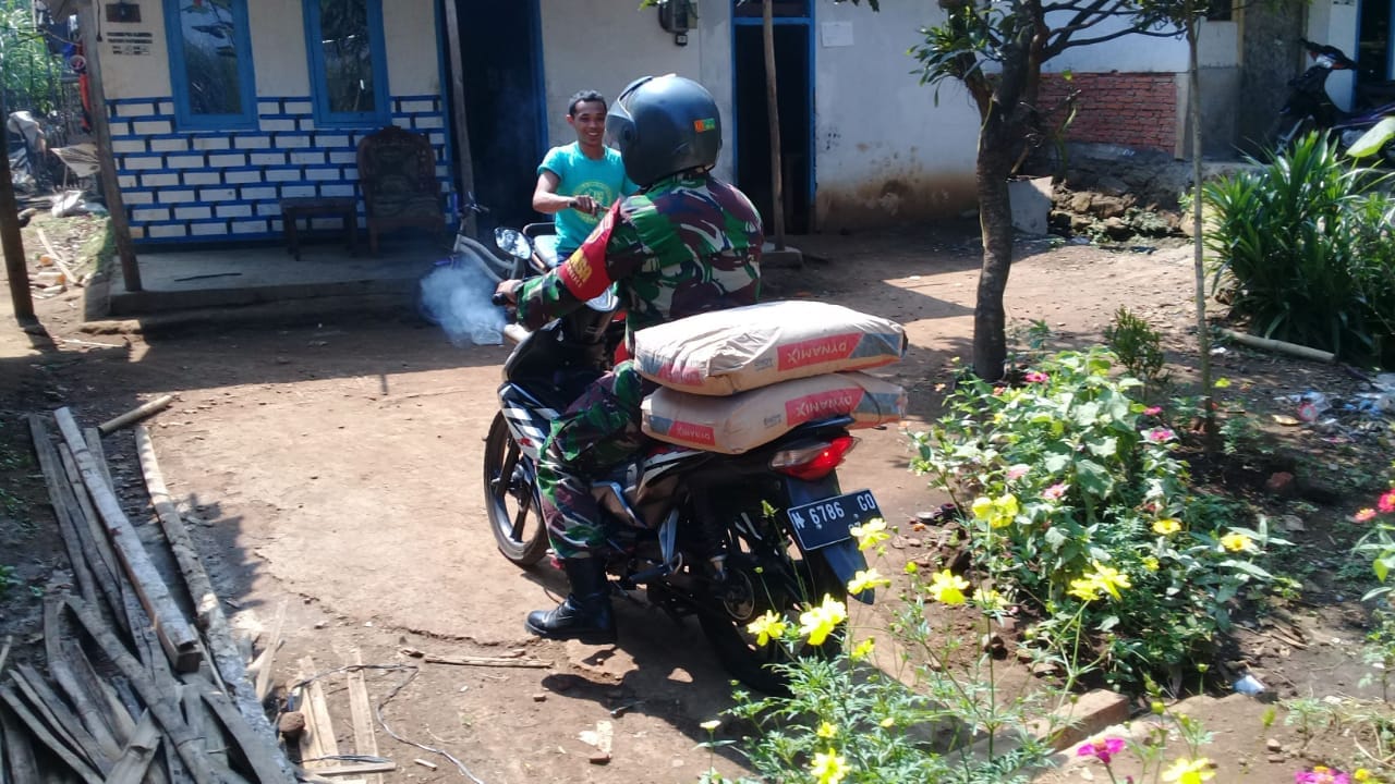 Nampak Babinsa Koramil 0818/23 Jabung Serma Supriyono menggunakan kendaraan motor pribadinya untuk mengangkat material semen yang di gunakan untuk membangun rumah warga yang tidak mampu.