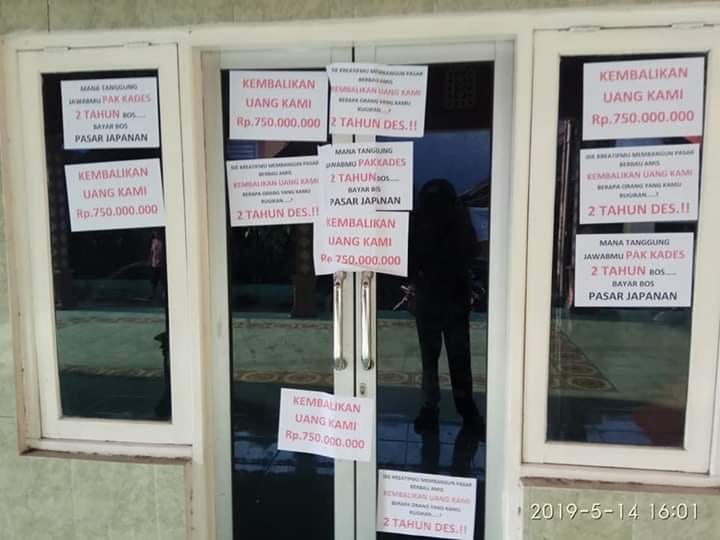 Informasinya, pukul 13.00 WIB, beberapa warga geruduk balai Desa Kejapanan. Mereka menempelkan puluhan stiker kepintu dan ruangan Kades Kejapanan, dengan bertulisan “Kembalikan uang kami dan mana tanggung jawabmu Pak Kades selama 2 tahun boos…bayar bos pasar japanan”.