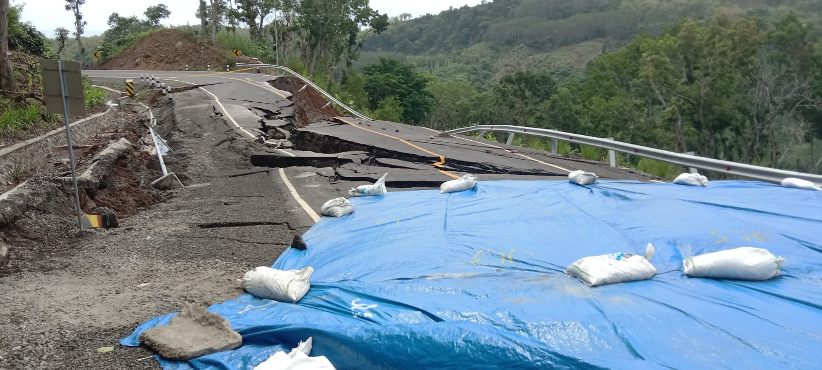 Kemudian, juga sudah dipasang sandbag dan pemasangan terpal. Hal itu untuk mencegah kerusakan lebih lanjut. “Selain itu, arus lalu lintas di area terdampak juga ditutup sementara waktu demi keselamatan pengguna jalan,” pungkasnya.
