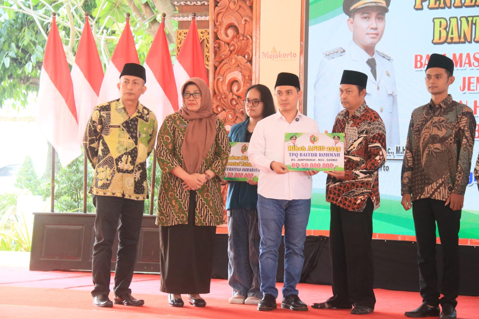 Diketahui beasiswa disalurkan kepada 13 orang mahasiswa, yang masing-masing mendapatkan 30 juta rupiah. Para mahasiswa tersebut berasal dari Universitas Surabaya (Ubaya), Universitas Islam Majapahit (Unim), dan Institut Agama Islam (IAI) Uluwiyah. Selain itu, untuk penyerahan hibah bagi lembaga keagamaan di Kabupaten Mojokerto, Total, Pemkab Mojokerto mengucurkan dana sebesar 28 miliar rupiah untuk 51 lembaga keagamaan. Kedua jenis hibah tersebut diketahui berasal dari APBD Kabupaten Mojokerto, tahun anggaran 2025.