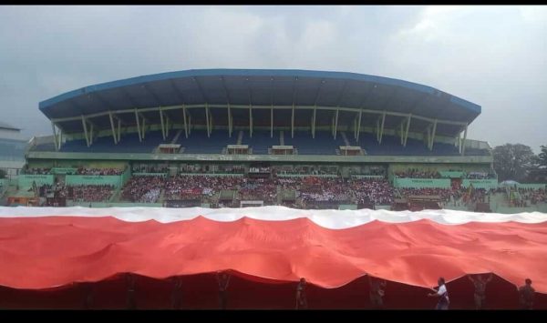 Kota Malang,Memo X – Bendera merah putih raksasa berkibar Pembukaan Liga Santri Piala Kasad Tahun 2022 di buka oleh Komandan Korem 083/Bdj Kolonel Inf Yudhi Prasetiyo, S.I.P. di Stadion Gajahyana Kota Malang, Senin (20/6/2021).