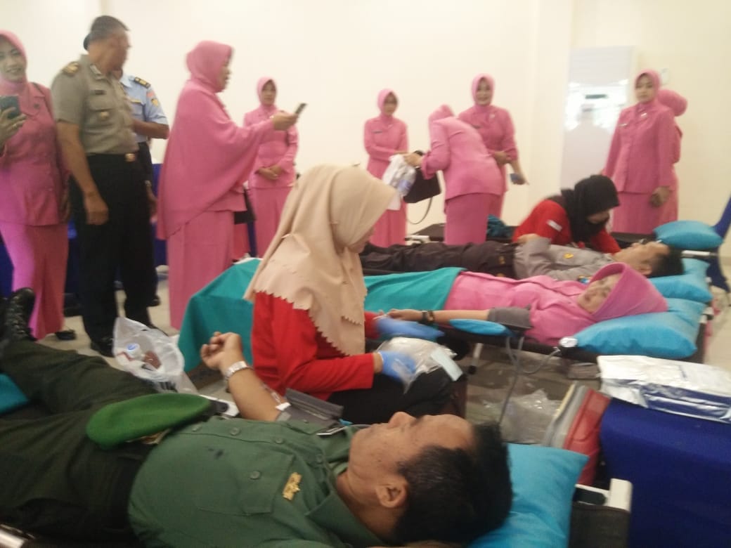 Bertempat di gedung Sanika Satyawada Polres Malang ratusan peserta donor darah diambil darahnya setelah menjalani proses pemeriksaan kesehatan oleh petugas medis.