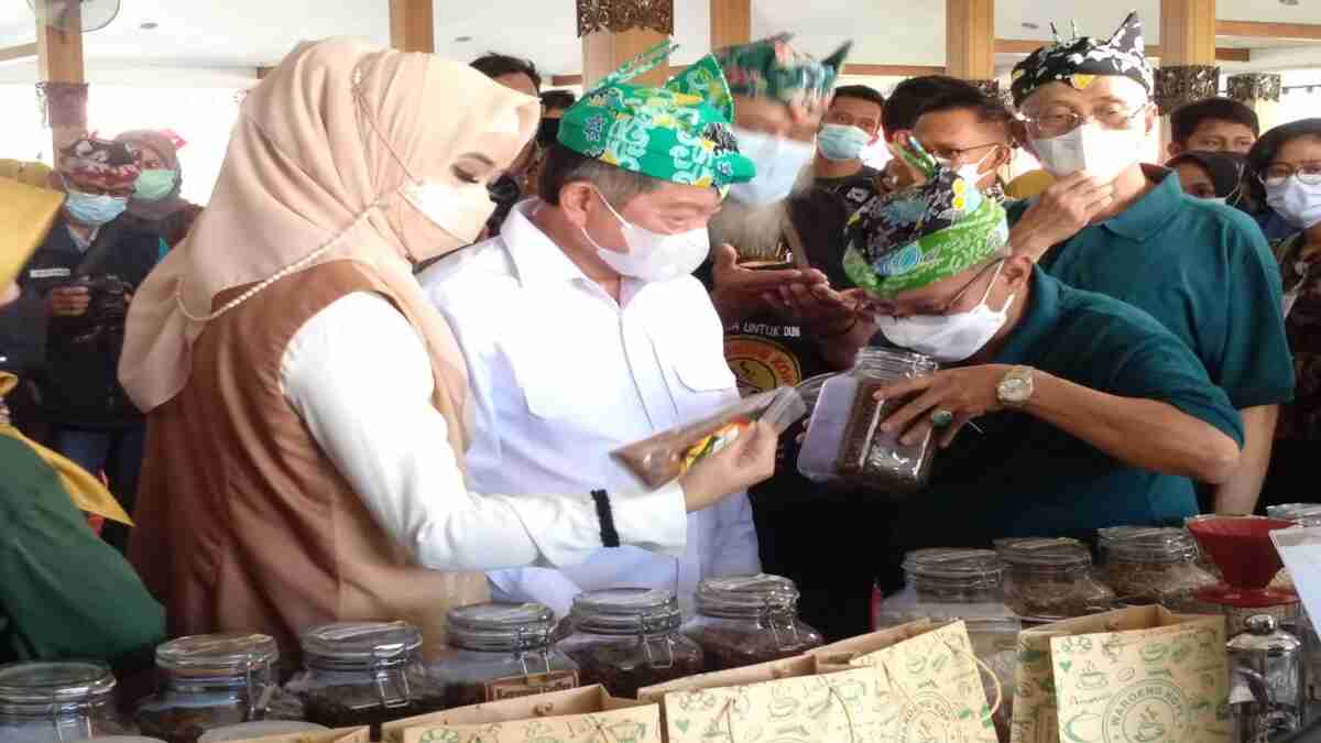 Usai launching GWC Situbondo, Bupati Situbondo Drs H Karna Suswandi MM bersama Menteri PPN/Kepala Bappenas mengunjungi stand kopi milik sejumlah pelaku usaha kopi kayu mas. (her/mzm)