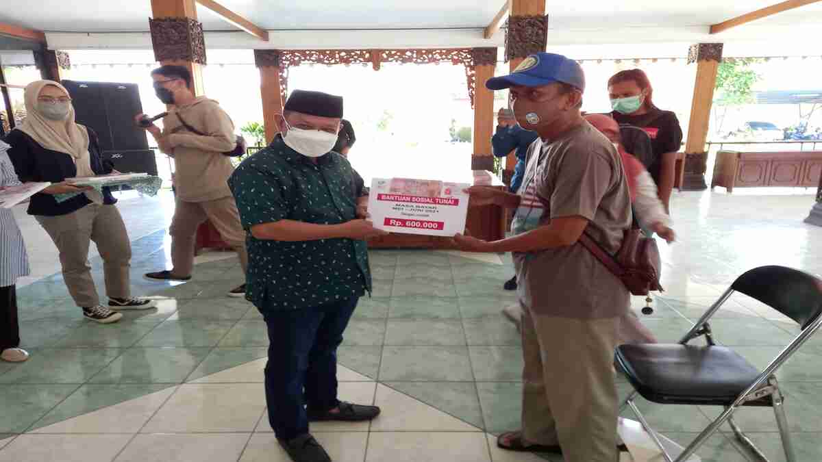 Bupati Situbondo, Karna Suswandi, saat memberikan BST secara simbolis kepada Keluarga Penerima Manfaat (KPM) masing-masing menerima Rp 600.000,- masa bayar bulan Mei dan Juni. (Memo X/her)