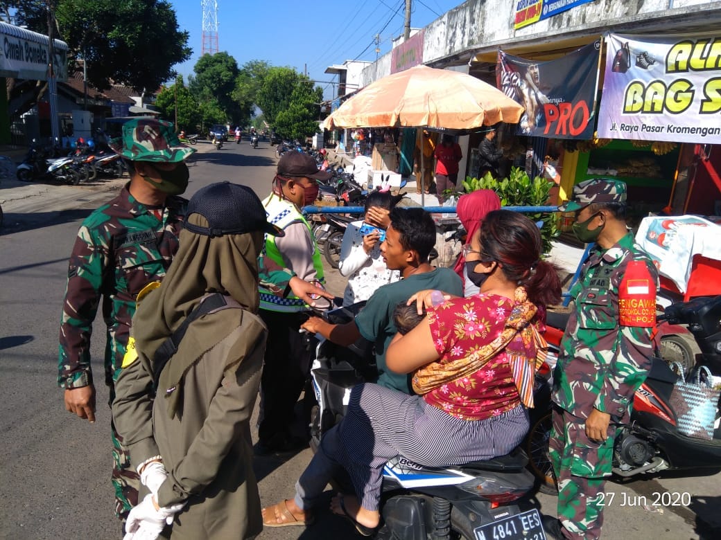 Seperti yang dilakukan di wilayah Posramil 0818/35 Kromengan, bersama anggota Polsek dan anggota Satpol PP serta Mantri Pasar, melakukan operasi penegakan disiplin di Pasar Tradisional Pasar Desa Kromengan alamat Jl. Naiulun Utara Dusun Krajan RT 23 RW 06 Desa Kromengan, Minggu 28/06/2020.