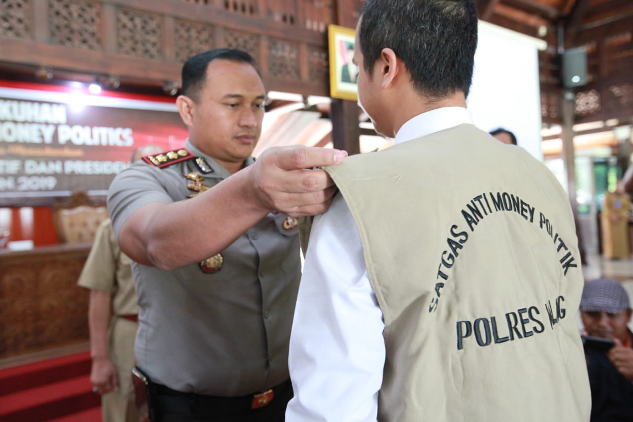 Pengukuhan Satgas Anti Money Politics oleh Kapolres Malang AKBP Yade Setiawan Ujung S.H.S.I.K.Msi dengan pemakaian Rompi kepada anggota Satgas.(fik)