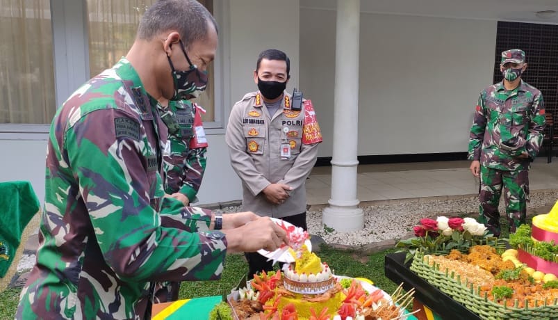 Pada kesempatan itu juga dilaksanakan pemberian potongan tumpeng oleh Danrem 083/Bdj Kol Inf Irwan kepada Kapolresta Malang Kota Kombes Pol Dr Leonardus sebagai ucapan Dirgahayu Bhayangkara ke 74.