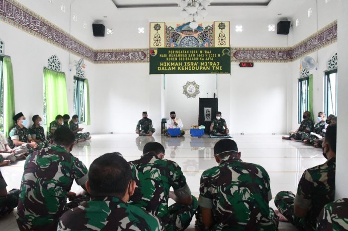 “Saya mengajak mari kita ambil hikmah momentum peringatan Isra Mi’raj Nabi Muhammad SAW ini sebagai sarana introspeksi dan meningkatkan ibadah sebagai nilai keimanan dan ketakwaan kepada Allah SWT. Kita harus bertekad agar apa yang kita kerjakan dalam menjalankan profesi sebagai prajurit benar-benar memberikan makna yang berarti bagi pencapaian keberhasilan tugas pokok TNI, khususnya di Korem 083/Bdj,” katanya.