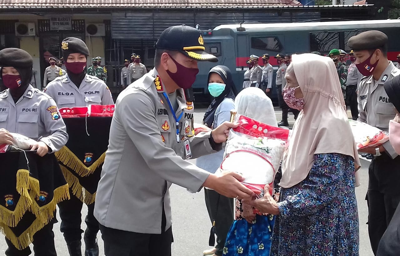 Kegiatan penyerahan bantuan beras 5 kg yang diberikan kepada masyarakat secara simbolis oleh Kapolresta Malang Kota Kombes Pol Dr Leonardus didampingi Dandim 0833/Kota Malang Letkol Inf Tommy Anderson.