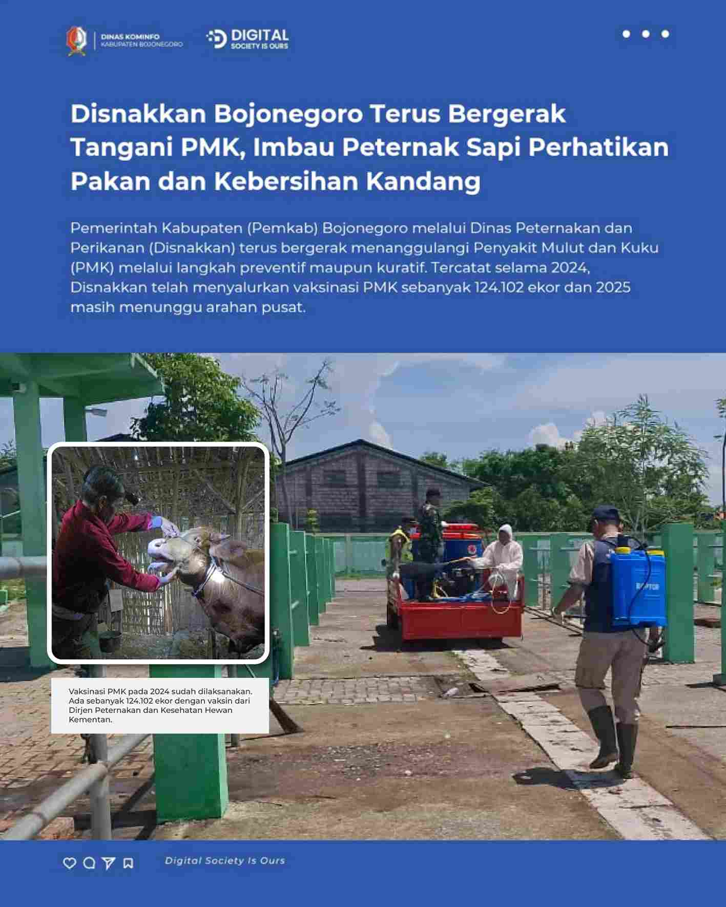 Kepala Bidang (Kabid) Kesehatan Hewan, Pengolahan dan Pemasaran Hasil Peternakan di Disnakkan Kabupaten Bojonegoro drh. Lutfi Nurrahman menjelaskan, vaksinasi PMK pada 2024 sudah dilaksanakan. Ada sebanyak 124.102 ekor dengan vaksin dari Dirjen Peternakan dan Kesehatan Hewan Kementan.