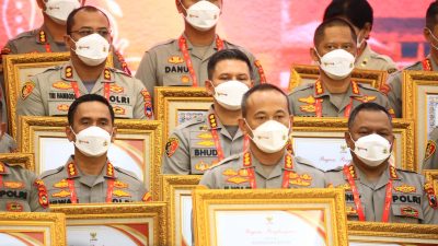 BERSAMA: Kapolresta Malang Kota Kombes Pol Buher ditengah para Kapolres yang menerima piagam penghargaan kategori Pelayanan Prima 2022