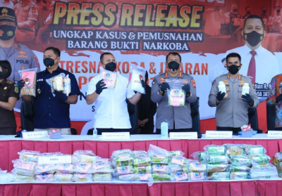 “Barang bukti sabu 90,7 kilogram sabu dan 13,3 kilogram ganja jaringan internasional Kamboja, Malaysia, masuk melalui Provinsi Riau, lalu ke Palembang, Jakarta, dan menuju Surabaya. Dengan tujuh orang tersangka,” terang Kombes Arie. (fik)