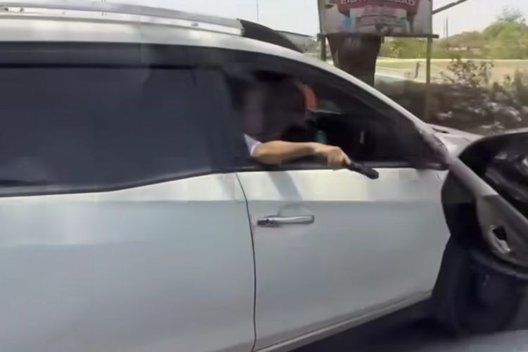 Pengemudi mobil berinisial SW (60) mengeluarkan pistol dan menembak ban mobil Pajero yang diduga menjadi penyebab kemacetan.