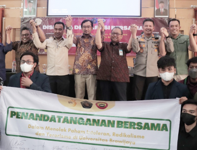 Deklarasi penolakan terhadap paham intoleran, radikalisme dan terorisme diikuti Rektor UB yang baru dilantik, Prof Widodo S.Si., M.Si., Ph.D. Med.Sc, Dekan FISIP UB, Dr Sholih Muadi SH., M.Si, Direktur Pencegahan Densus 88 Kombes Tubagus Ami Prindani, dan tamu undangan yang lainnya.