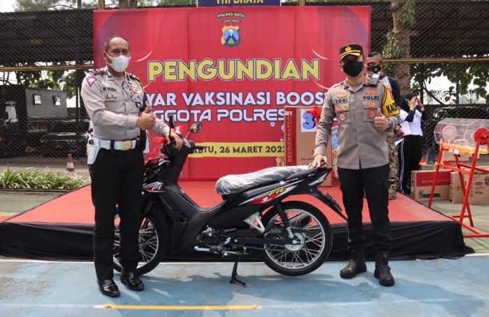 Batu, Memox.co.id – Polres Batu kembali membagikan doorprize kepada anggota Polres Batu yang sudah melakukan vaksinasi dosis booster usai pelaksanaan olahraga bersama di Lapangan Upacara Mapolres Batu, Sabtu (26/03/2022).