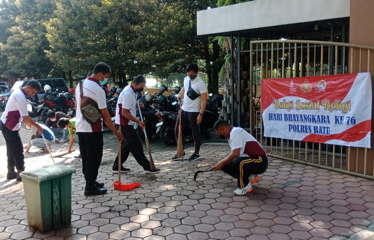 Dalam giat Baksos Religi dikawasan Gereja Gembala Baik dipimpin Kasat Binmas Polres Batu, Iptu Dwi Jatmiko, bersama beberapa anggota kepolisian Polres Batu dibantu pengurus dan jemaah gereja kegiatan bersih-bersih tersebut berjalan dengan penuh rasa kekeluargaan.