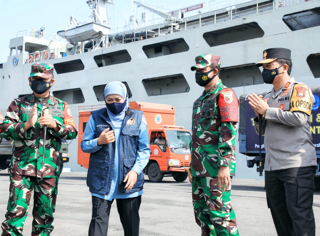 Bersama jajaran Forkopimda, Khofifah Indar Parawansa pun memberangkatkan bantuan tersebut di Dermaga Madura Ujung, Makoarmada II Surabaya, Kamis (15/4) pagi.