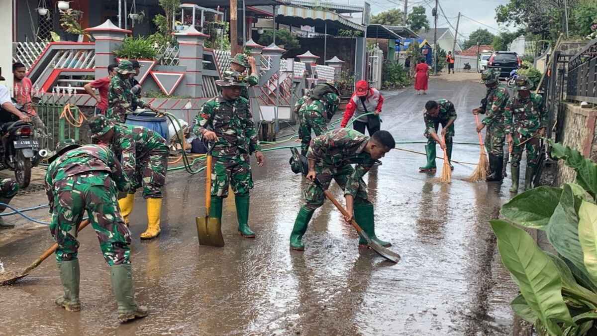Kota Batu, Memox.co.id – Sisa-sisa material yang berjatuhan dari Dump Truck yang bersihkan Tanah dan lumpur pasca bencana mulai dibersihkan oleh anggota TNI dari Yonif 527/BY, Rabu (10/11/2021).