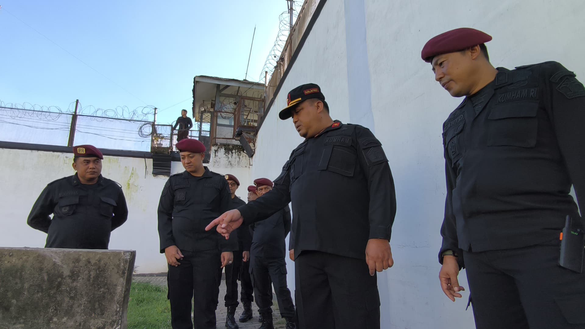 Mereka bersama-sama meninjau kondisi sarana dan prasarana keamanan yang ada di lapas. Pemeriksaan dilakukan secara menyeluruh untuk memastikan setiap titik pengamanan berfungsi optimal.