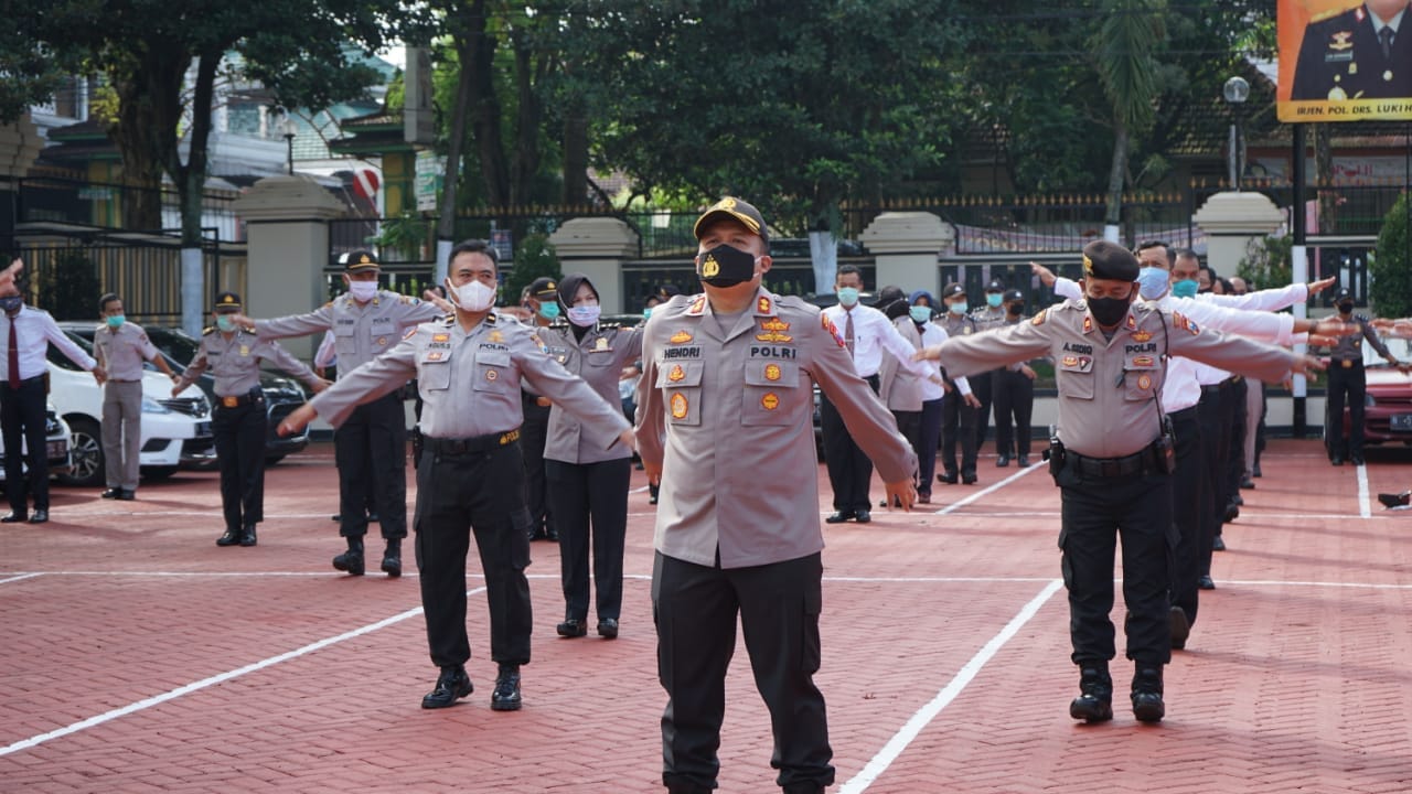 Malang,Memox.co.id- Kapolres Malang AKBP Hendri Umar S.I.K.MH ajak anggota untuk melakukan senam AW S3 usai pelaksanaan apel pagi, bertempat dilapangan upacara Satya Haprabu Polres Malang, Senin (27/04/2020).