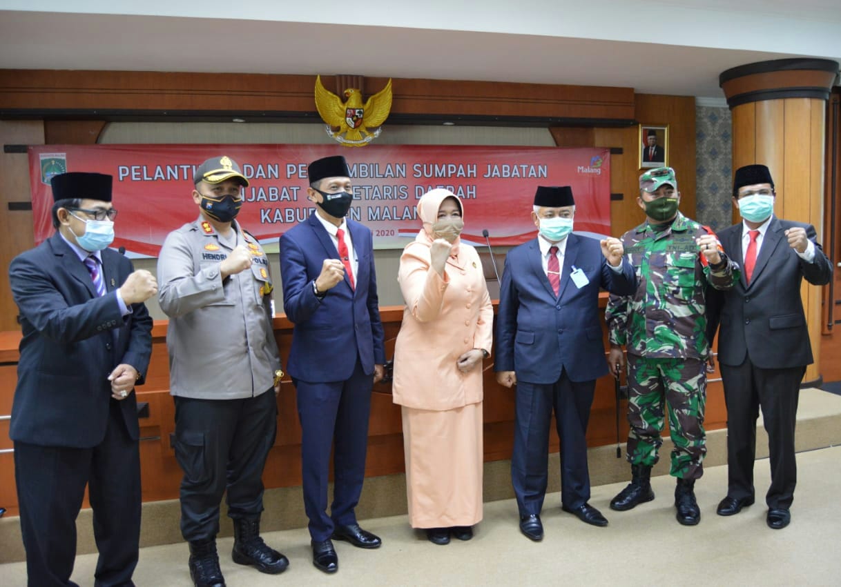 Pelantikan Sekda Pemkab Malang yang dipimpin langsung Bupati Malang Sanusi berlangsung di Pendopo Pemkab Malang dengan tetap mengedepankan protokol kesehatan Covid-19.