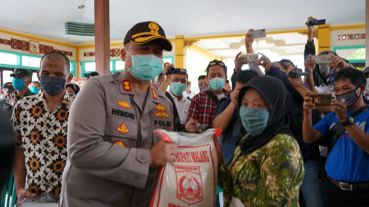 Selian beras Kapolres Malang AKBP Hendri bersama Bupati Malang Sanusi,Dandim 0818 Kab Malang-Batu Letkol Inf Ferry Muzawwad S.I.P dan Ketua DPRD Kabupaten Malang Didik Gatot Subroto juga membagikan masker.