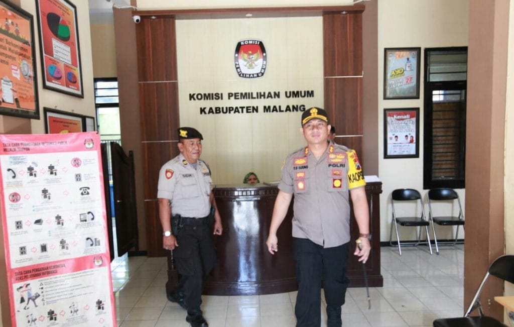 GEDUNG :Kapolres Malang AKBP YS Ujung S.H.S.I.K.Msi saat melaksanakan pengecekan kondisi keamanan gedung KPU pasca Pemilu 2019.