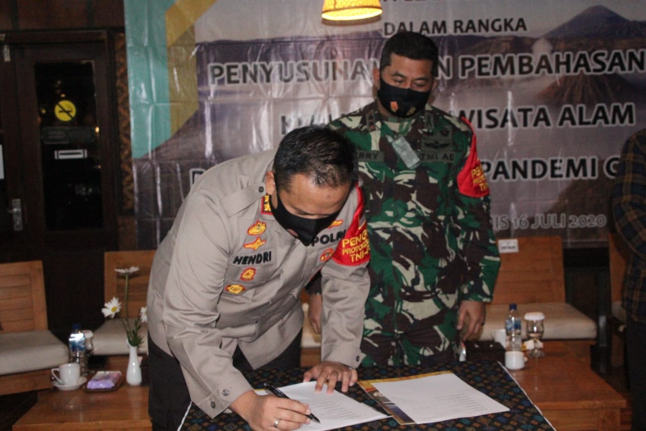 Malang,Memox.co.id – Kapolres Malang AKBP Hendri Umar S.I.K.MH bersama Forpimda Kabupaten Malang, Lumajang, Kabupaten Probolinggo dan Kabupaten Pasuruan melaksnakan penandatanganan SOP kunjungan wisata alam di TNBTS (Taman Nasional Bromo Tengger Semeru), Kamis (16/07/2020).