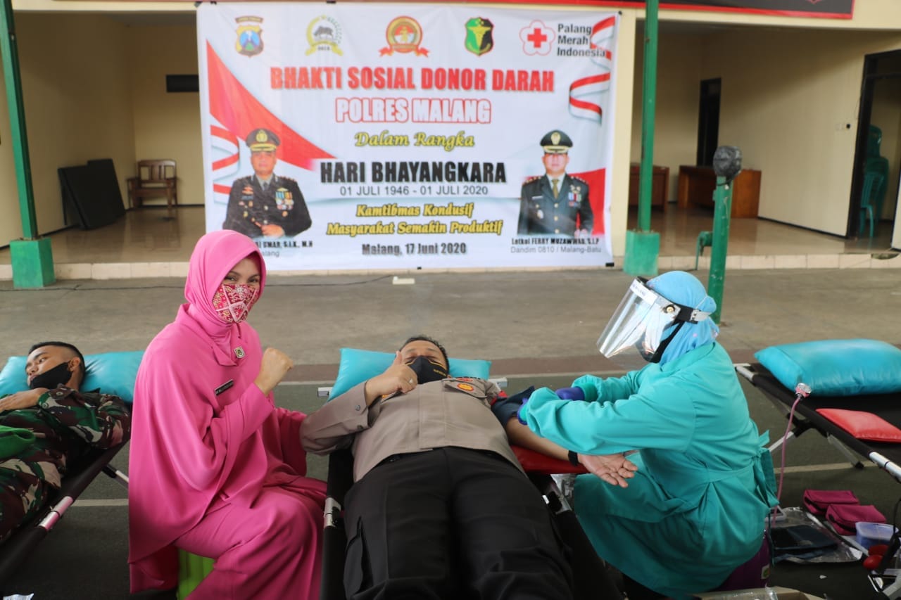 Giat donor darah dalam rangka peringatan HUT ke 74 Bhayangkara 2020 yang diperingati setiap tanggal 1 Juli bertempat di lapangan tenis Mapolres Malang diikuti juga anggota Kodim 0818 Kab Malang-Batu bekerjasama dengan PMI Kabupaten Malang