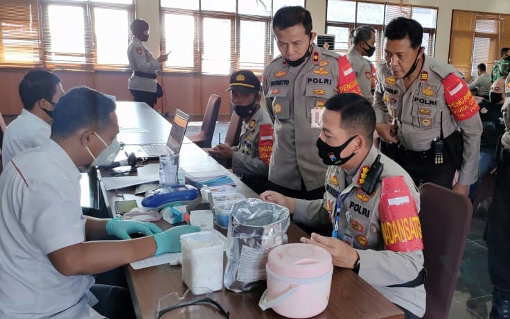 Bertempat di Aula Sanika Satyawada Polresta Malang Kota kegiatan donor darah dalam rangka peringatan HUT ke 74 Bhayangkara 2020 diikuti sekitar 90 anggota yang dinyatakan layak untuk diambil darahnya termasuk Kapolresta Malang Kota Kombes Pol Dr Leonardus.