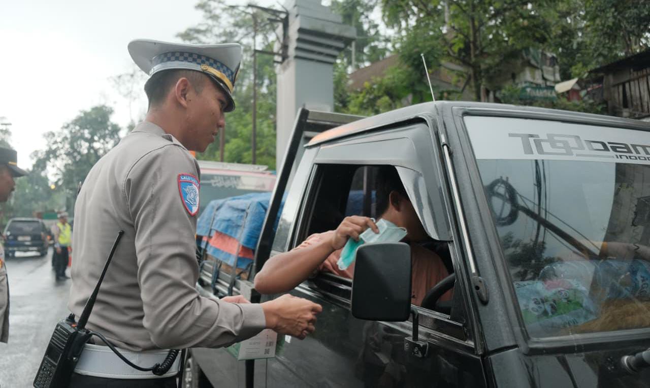 Selain menjaga kesehatan, pembagian masker ini juga bagian dari edukasi Operasi Zebra, mengingat helm tertutup dan masker bisa membantu menjaga jarak pandang dari gangguan debu saat melintas.