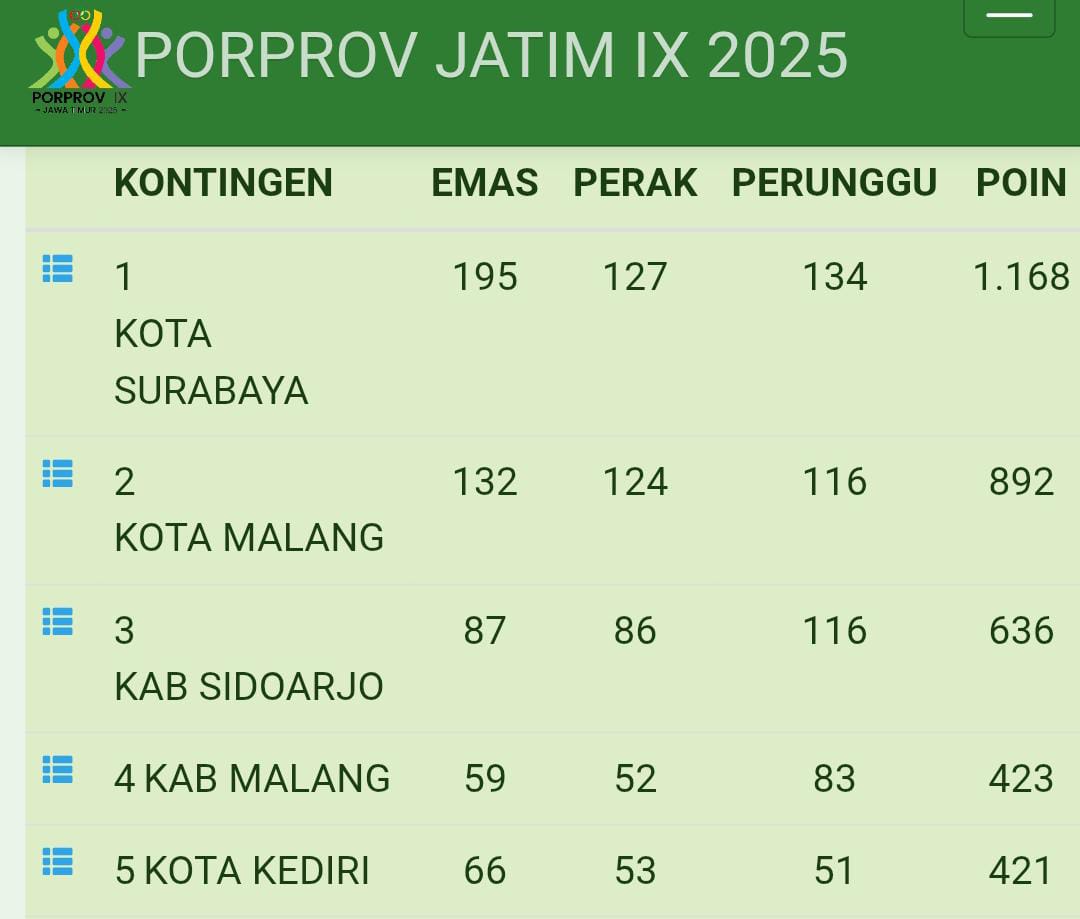 Malang, MEMOX.CO.ID – Klasmen akhir Pekan Olahraga Provinsi (Porprov) IX Jawa Timur 2025 cukup menarik. Pasalnya, skor perolehan medali antara Kota Kediri dengan Kabupaten Malang hanya selisih 1 poin.