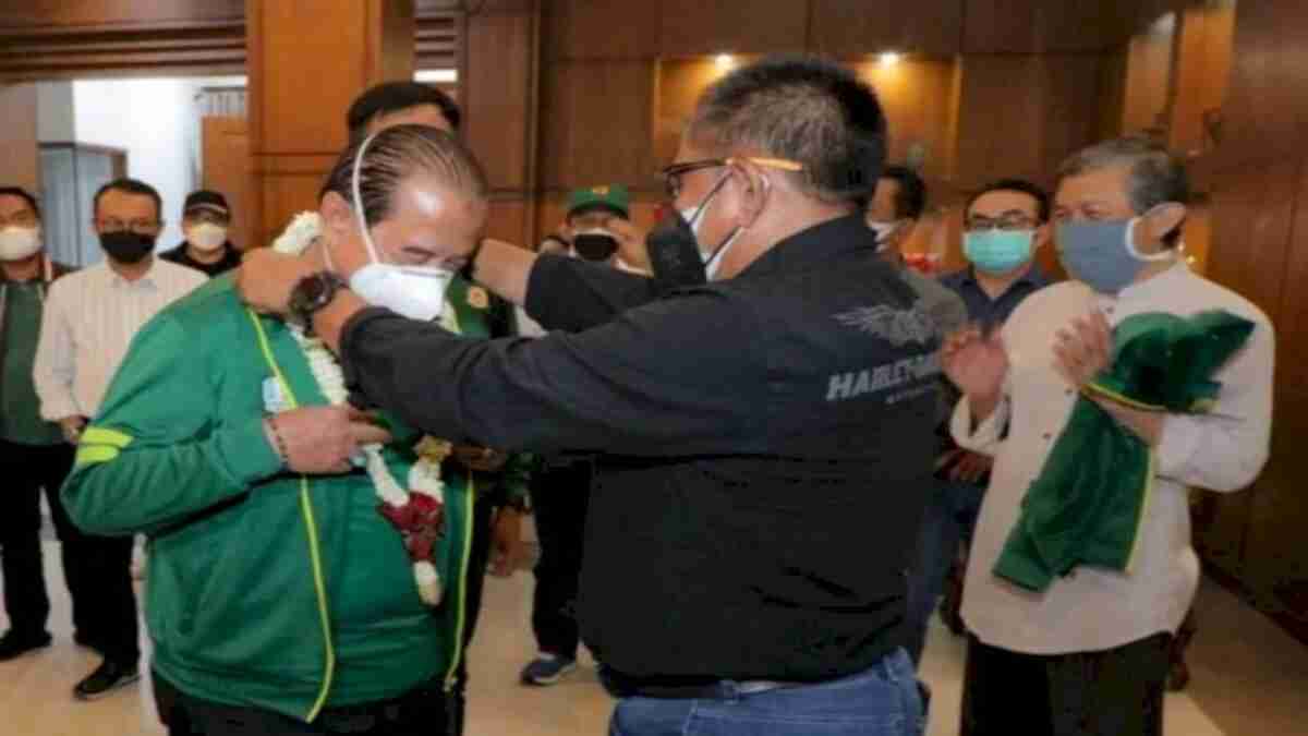 UCAPAN SELAMAT : Plh Sekdaprov Jatim, Heru Tjahjono (kanan) mengalungkan bunga ucapan selamat datang kepada Ketua Umum KONI Jatim, Erlangga.