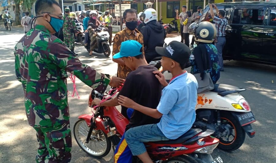 Malang,Memox.co.id-Koramil 0818 /08 Wagir bersama Polsek Wagir dibantu tenaga relawan bagikan masker kepada warga yang melintas di depan Makoramil 0818/08 Wagir Kamis (16/04/2020).