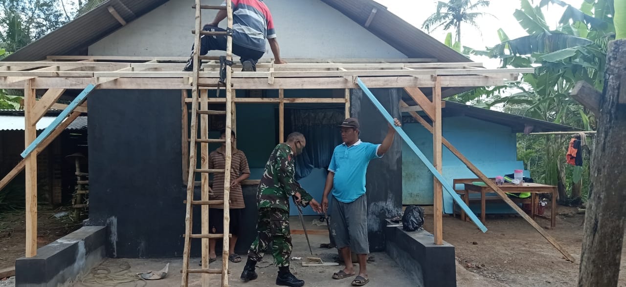 Anggota Koramil 0818/23 Jabung bersama warga buatkan teras rumah untuk Ibu Suniyem penerima bantuan Bedah Rumah Rumah Tinggal Layak Huni (Rulitahu). Nampak kedekatan anggota Koramil 0818/23 Jabung bersama masyarakat merangkai balok kayu untuk teras rumah warga. Bangunan induk rumah rumah telah dikerjakan sebelumnya.
