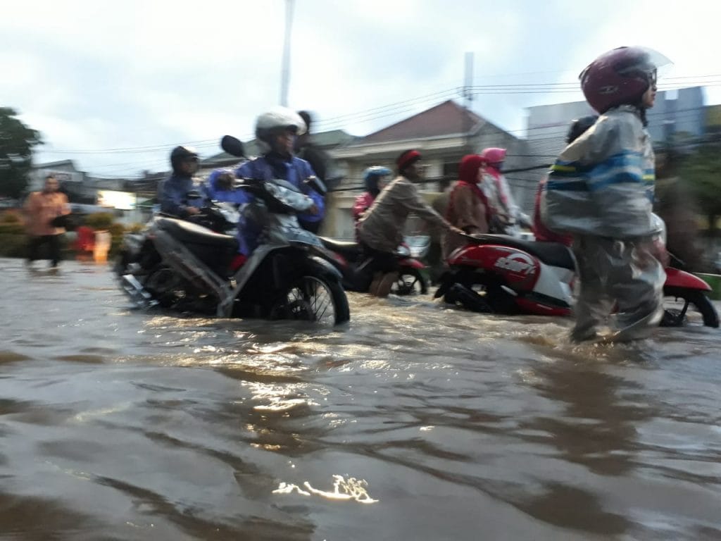 Novi, salah seorang pengendara bermotor memilih berhenti memarkir motornya di trotoar. ” Saya sudah lebih dari 30 menit berhenti. Banjir tidak juga surut. Rencananya saya mau ke Claket. Namun daru pada motor saya rusak, saya memilih untuk berhenti,” ujar Novi yang saat ditemui Memontum.com, terlihat duduk di sebelah utara banjir.