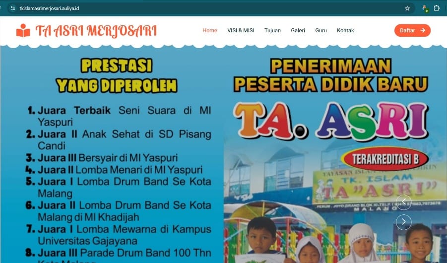 Website profil TK Islam Asri (https://tkislamasrimerjosari.auliya.id/ ) dirancang dengan antarmuka yang ramah pengguna dan berisi beragam informasi penting mengenai visi, misi, kurikulum, kegiatan ekstrakurikuler, dan fasilitas yang tersedia di TK tersebut. Selain itu, terdapat pula galeri foto yang memperlihatkan momen-momen berharga serta pencapaian anak-anak dalam berbagai kegiatan.