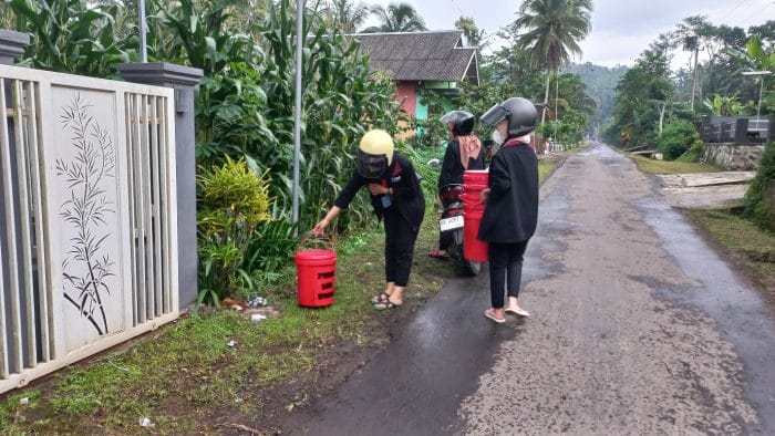 Tempat sampah yang kami sediakan berasal dari ember cat bekas yang kemudian kami daur ulang dengan melakukan proses pembersihan dan pengecatan. Tempat sampah yang kami sediakan sebanyak 10 tempat sampah yang kemudian kami sebarkan dengan jarak 150-200 meter per tempat sampah. (*)