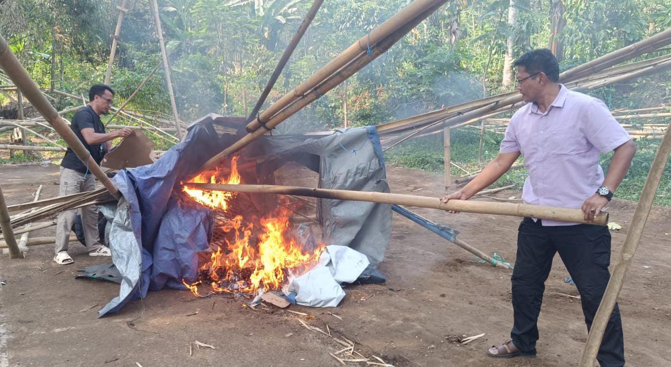 Sebagai langkah preventif, petugas kemudian membongkar dan memusnahkan sisa bangunan yang berpotensi digunakan kembali untuk kegiatan serupa. Pembongkaran dilakukan dengan cara membakar atap bambu dan sisa terpal di sekitar area tersebut.