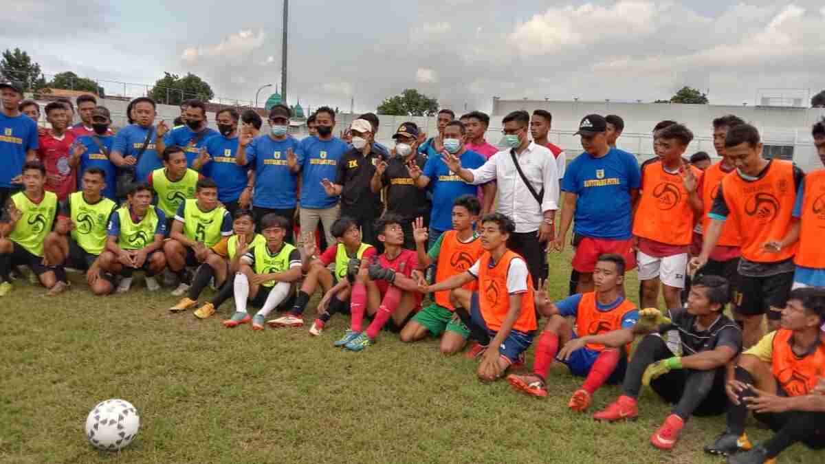 Wakil bupati Banyuwang, H. Sugirah (kaos hitam pakai topi putih) bersama manajemen, pelatih dan pemain sepak bola, bertempat di stadion Diponegoro, Kamis (24/6/2021)