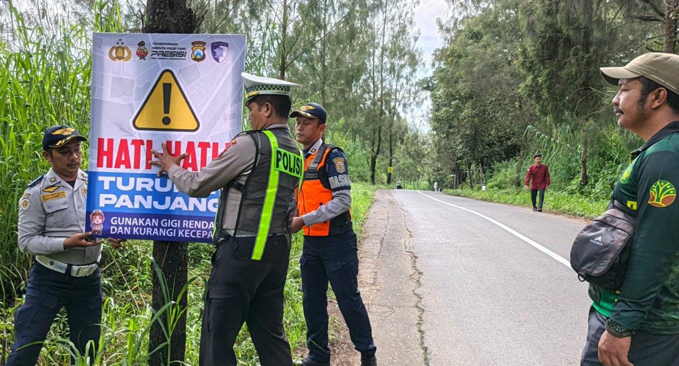 Ia menegaskan, pesan yang disampaikan melalui banner antara lain peringatan turunan panjang, jalan menurun, serta tikungan tajam, yang kerap menjadi faktor risiko kecelakaan jika pengendara tidak mengantisipasi kondisi kendaraan dan jalan.