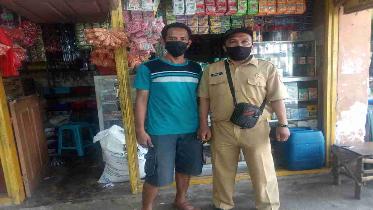 Mereka berbaris didepan lapak dagangannya sambil bersikap tegap pandangan lurus kedepan yang dipandu oleh pengelola pasar,sambil mendengarkan imbauan antisipasi Covid 19, Senin (14/6/2021).