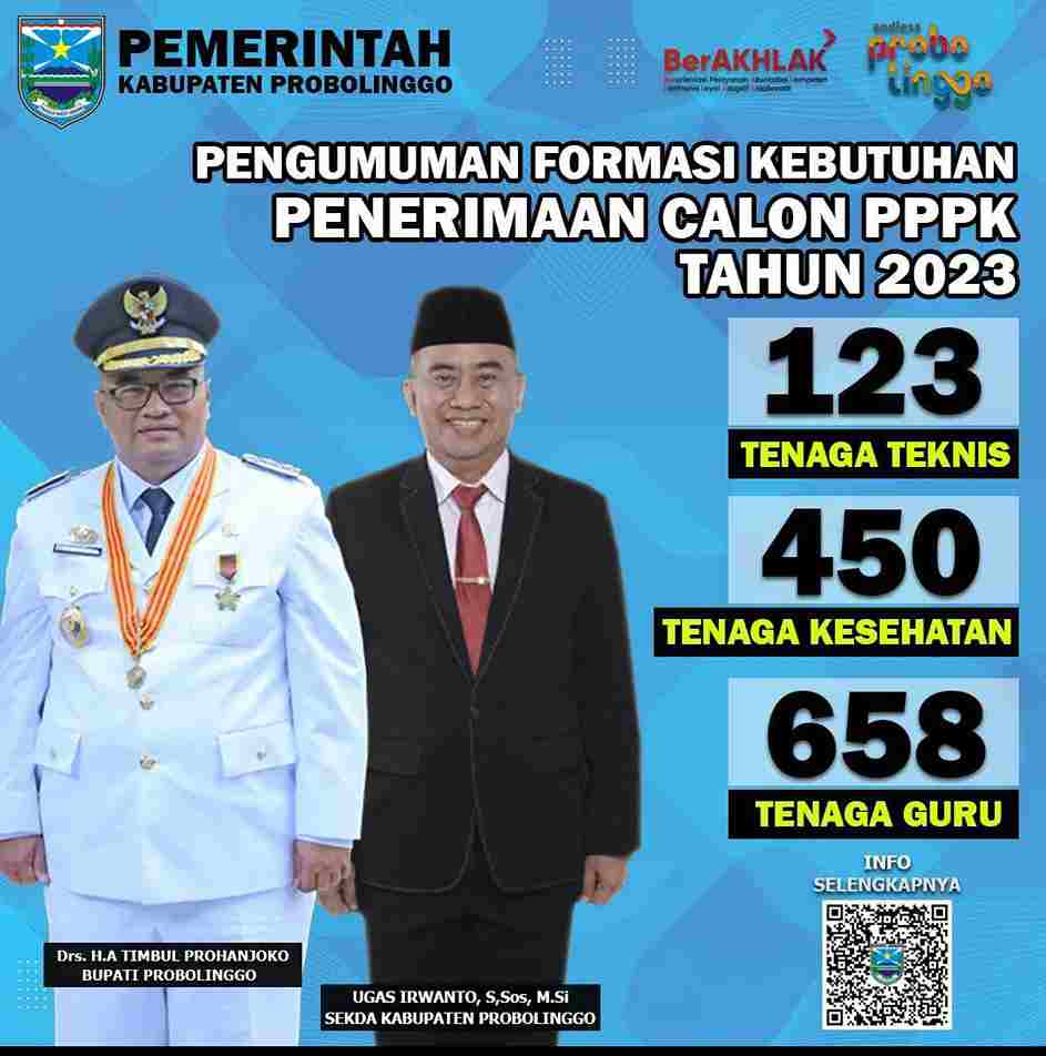 MEMOX.CO.IDPemerintah Kabupaten Probolinggo membuka lowongan sebanyak 1.231 Pegawai Pemerintah dengan Perjanjian Kerja (PPPK) di 2023. Dari jumlah tersebut, formasi tenaga guru lebih banyak dibutuhkan. Jumlah formasi guru yang dibutuhkan sebanyak 658 orang, formasi tenaga kesehatan 450 orang, dan tenaga teknis sebanyak 123 orang.