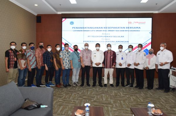 Lamongan, Memo X – Guna mempercepat dan memperluas akses digitalisasi smart city di Kabupaten lamongan, Pemerintah Kabupaten Lamongan menandatangani kesepakatan bersama PT Telekonikasi Seluler terkait program digital smart city, Rabu (16/3/2022) di Ruang Command Center Kabupaten Lamongan.