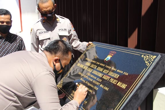 PRASASTI: Penandatanganan prasasti oleh Kapolres Malang AKBP Hendri atas diresmikan Gedung Wicaksana Laghawa.