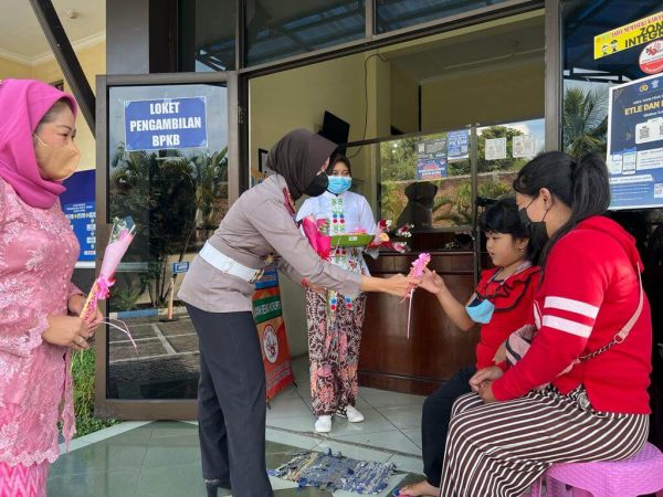 Bersama beberapa anggota Polwan Satlantas Polres Batu yang mengenakan kebaya Kartini Kasat Lantas AKP Indah secara langsung menyapa masyarakat wajib pajak kendaraan bermotor sambil memberikan bunga sebagai simbol rasa kasih sayang dengan sesama.